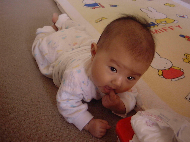 寝返りはだんだん慣れてきたみたいで、よくころんころんと転がるようになった。気がつくとテーブルの下にまで転がっている。1回転半してるんだな。不機嫌になったり退屈したりした時も、寝返りするようだ。泣き声にやれやれと思って見てみると、うつぶせに回った状態で泣いてたりする。油断できない。