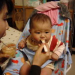 離乳食は、最近はまた手抜きモードである。混ぜごはんの鶏肉をそのままやったり、味噌汁の豆腐を取りだしてやったりしている。最近の好物はヨーグルトらしい。それも「タカナシなめらかヨーグルト」という、高級なのが好きなようだ。これはちょっと甘くておいしいので日南子には禁断の味だったかもしれない。うかつだった。あまりおいしすぎるものをやると、ほかのを食べなくなるかも。あと、味噌味が好きなようだ。おかゆでも、味噌汁をかけてやると喜んで食べるようだ。離乳食の後はコップで麦茶とか果汁を飲ませるのだが、どうもこのコップ(カエル柄)が好きなようで、見るとにこにこ笑う。