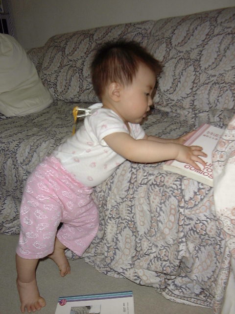 今回は日南子はすっかりなれちゃって、いろいろ探検していた。どんどんすみっこにいっちゃってテレビの陰に隠れてしまった。あと、ソファをのぼって乗り越えようとする。落ちたら痛いというのが分からないから大胆である。おっこちそうになるたびに、私とカー君のお母さんがあわてて日南子の足をつかんで止める。日南子はそのたびに逆さづり。余談だが赤ちゃんって逆さづりが大好きだ。日南子はよく真基さんに逆さにしてもらって大喜びしている。満面笑顔で「うわーきゃははは」と変な歓声をあげる。カー君もおかあさんに逆さにつられていて嬉しそうだった。しかし赤ちゃんって思いもよらぬ行動をとるもんだ。私もカー君のお母さんも笑いっぱなしであった。