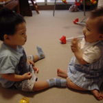 うちによその赤ちゃんが遊びに来たのは日和ちゃん以来。カー君は間取りが同じだけど家具とか違うなあという感じできょろきょろしていた。台所が好きなようで、何度も私の手をひっぱって台所にいく。保存壜の空きビンが気になるようで、何度も触る。日南子はあいかわらずカー君にぺたぺた触って、カー君の服につかまって立とうとする。立っているカー君の後ろにまわっておしりを触ったりする。おいおい、日南子、エッチだなあ。