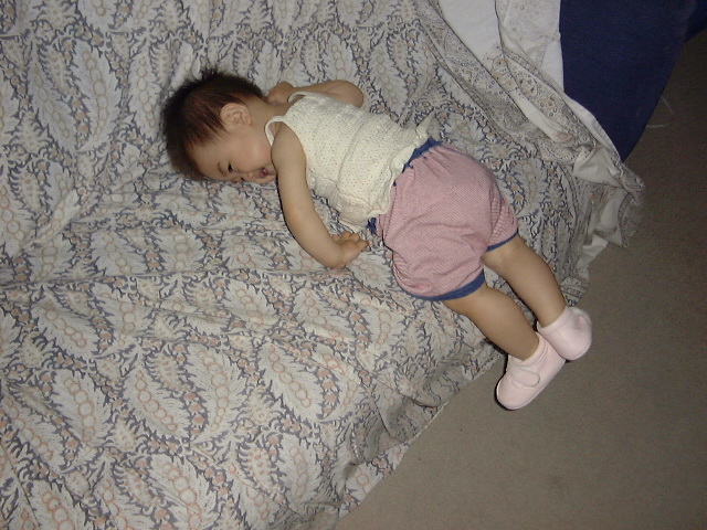 最近、自力でベッドやソファに登るようになったのだが、そのポーズがなんともいえずおかしい。「うんしょ」ってかんじで短い足を必死でソファにかけてよじのぼるのだ。降りる時も、いっちょまえに慎重にそろりそろりと後ろ向きに足をおろし着地。気がつくと、ソファに座ってたりするので、ぎょっとすることもしばしば。